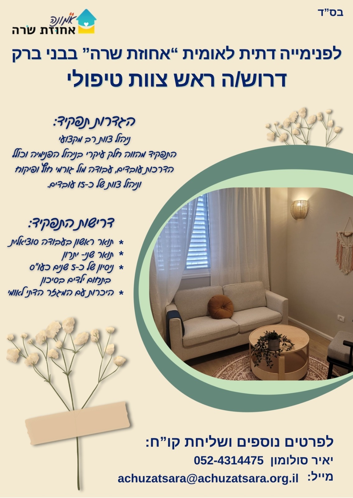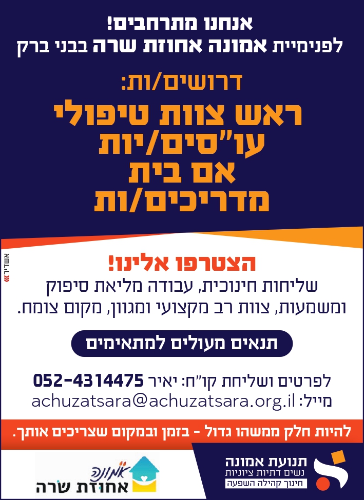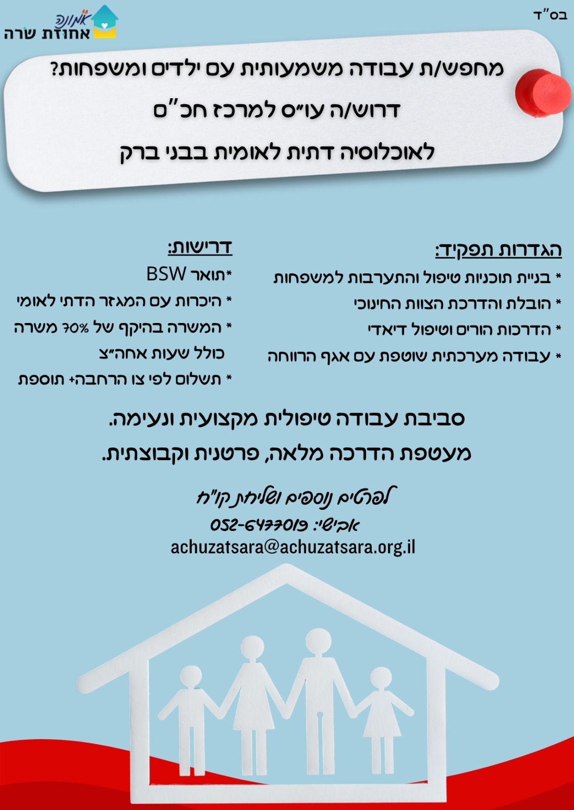 דרושים בואו להיות חלק מאמונה אחוזת שרה זוג לעבודה חינוכית מטפל/ת בעזרת בע"ח דרושים מדריכי לילה דרושות משפחות מלוות זוג לעבודה חינוכית דרושות אימהות בית