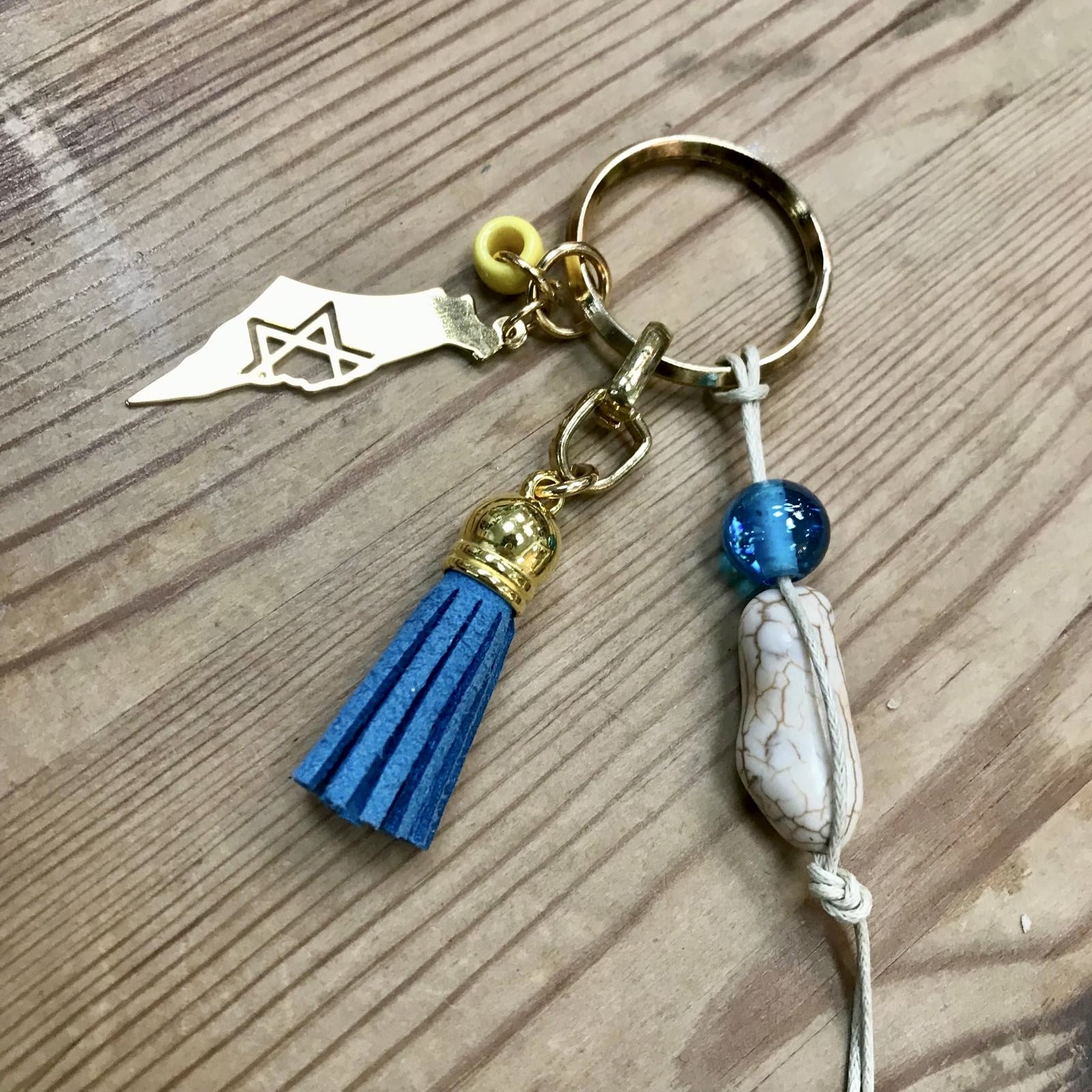 מחזיק מפתחות 'אני ישראלי' כחול לבן עם תליון מפת ישראל, גדיל ואבנים
