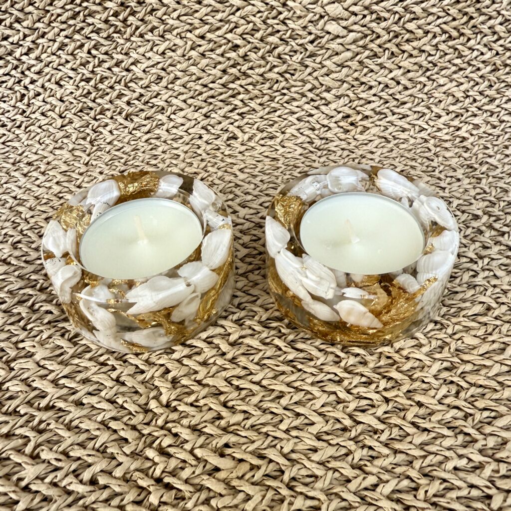 פמוטים אפוקסי עבודת יד עם צדפים טבעיים ועלי זהב