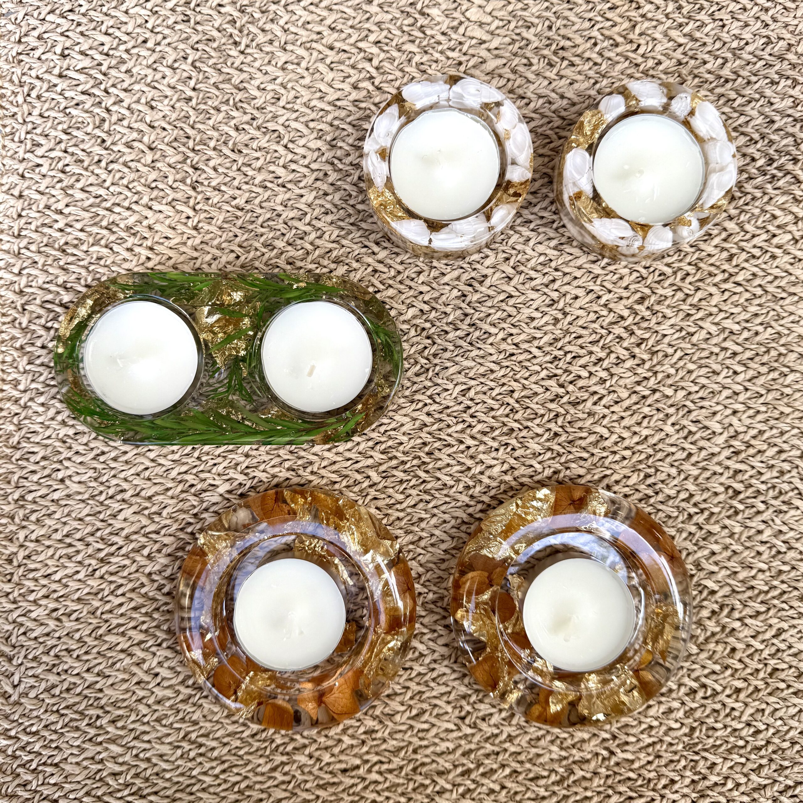 פמוטים אפוקסי בעבודת יד עם עלים וצדפים טבעיים ועלי זהב