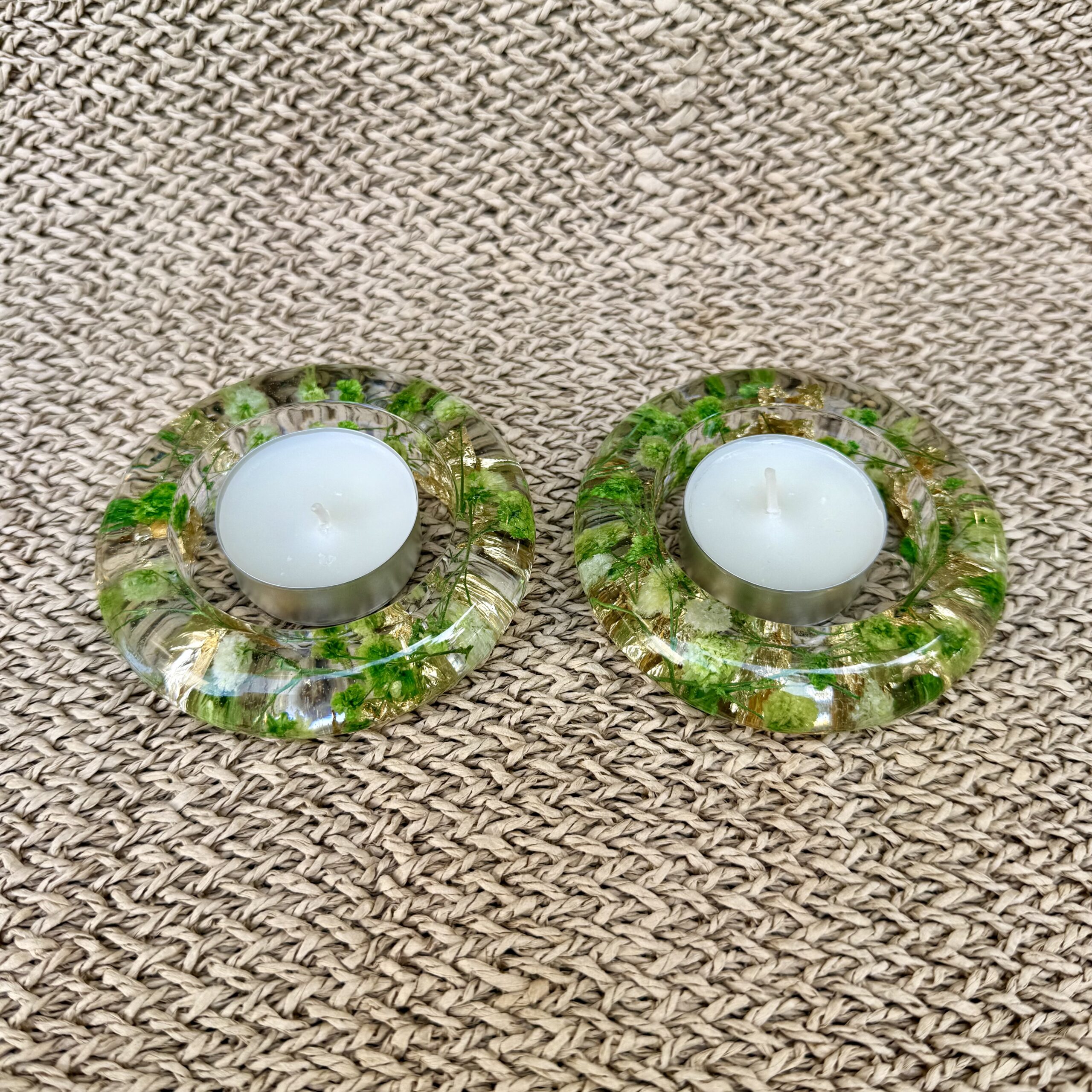 פמוטים אפוקסי בעבודת יד עם פרחים טבעיים ועלי זהב 109 ₪